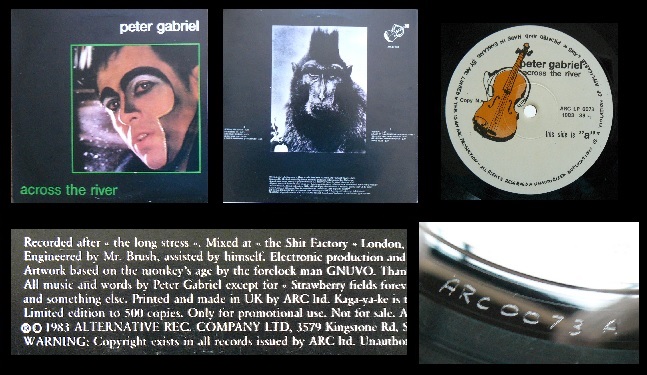 上の写真はAlternative Recording Company から同じ1983年にリリースされたPeter Gabrielの「Across The River」(ARC LP 0073)だが、やはりカバー・アートはGNUVOによるものだ。この盤を含めAlternative Recording Companyのプレス枚数は500枚と書かれているタイトルが多く、実際一回のプレス枚数はその程度の様である。しかしビートルズの2タイトルにはそのような明記は無いのでもっとプレスされている可能性があるのと、特にこれら2タイトルは後述する白黒の小さめのフロントスリックでリイシューされ、それらは日本でも多数出回った。