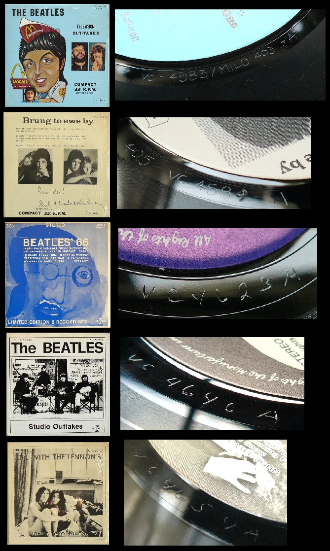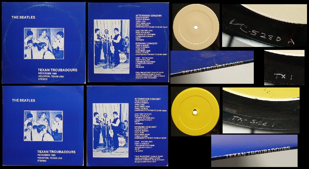 ではTexan Troubadours (VC5280, SH25)はどうだろうか。1985年のビートルズ海賊盤事典には「マスターテープから作られている」と書かれている。確かにこの盤はコピーではない。しかし臨場感は異なっており別マスタリングであるものの編集は全く同一である。仮にBVP 006をプレスした人物が、同じテープを利用してプレスしたとしたら・・・、それはもちろん可能だが、まったく無意味なことだろう。というのも、このプレスは「VC5280」というナンバーから1980年春頃と推定される。BVP006は(SH05)のPODレーベル盤をプレスした頃である。そしてその後も同じ仕様でSH06がプレスされ、以降同一スタンパーで(一度マザーから新しくしてはいるが)1980年代後半まで続く。にもかかわらず、同じブートレッガーが別マスタリング、別タイトル、別カバーでプレスするはずはない。