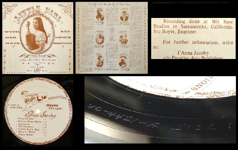 下の写真は同じプラントでプレスされた正規レコードで、J'Anna Jacobyというバイオリニストによる「Little Girl With Her Hair All Down Behind」というタイトルの1976年リリースLPである。マトリックスはVC 4421、バック・カバー記載の内容からサクラメントのスタジオで録音されたことがわかるが、実はこのスタジオは1966年にレコーディング・スタジオとして開設され、その後事業は拡大しレコード制作まで行うようになった。2006年に閉鎖となったそうである。