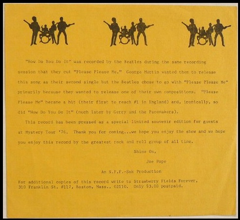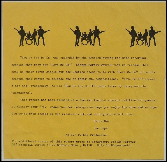 シングル盤はJoe Pope氏によるファン・クラブ、Strawberry Fields Forever(SFF)を通し通信販売された。また1976年7~8月にかけてボストンで行われたビートルズ・コンベンション「Mystery Tour '76」の会場でも販売された。