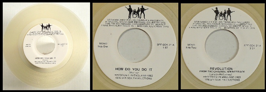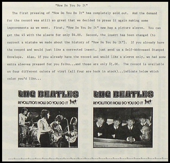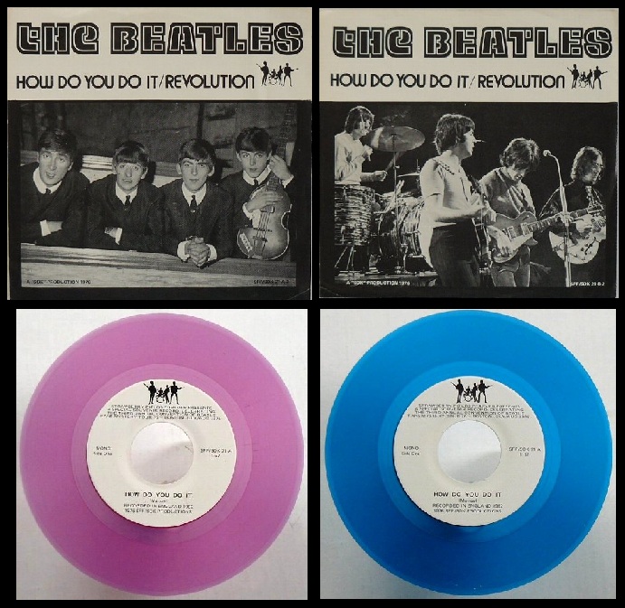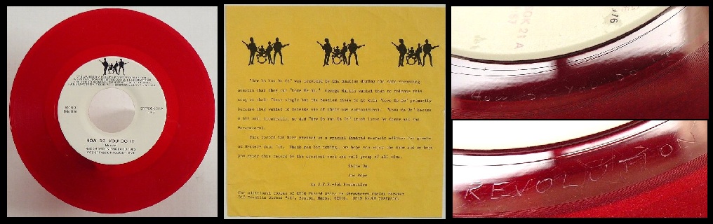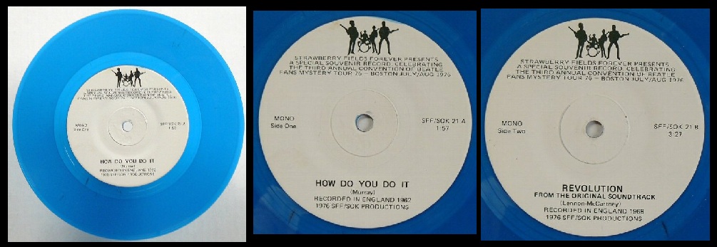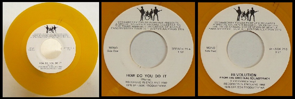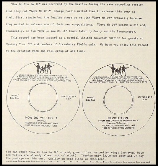 1976年6月頃に送付されたSFFニューズ・レターNo.20には7月下旬から8月初めまで行われる「Mystery Tour '76」のスケジュールが同封され、次のNo.21には「How Do You Do It / Revolution」のオーダー・シートが同封された。それによると、最初のプレスにはピクチャー・スリーブはついていない。レコード・カラーはレッド、グリーン、ブルー、イエローの4種類でプレスされた。
